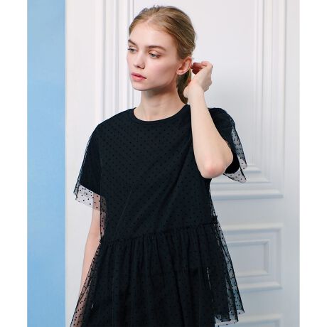 カットソーに透け感のあるドットチュールを重ねたレイヤードTシャツ。