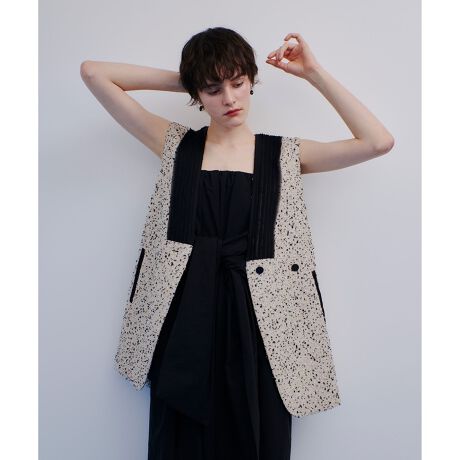 ブラックのポリエステルシフォンを、バイヤス裁ち切りで細かく重ねて付けたフロントディテールがアクセント。オリジナルメタルボタンの位置をずらして留めると、少しタイトなシルエットに変化します。 リネンシャツドレスとのスタイリングが、すっきりとシャープでおすすめです。
