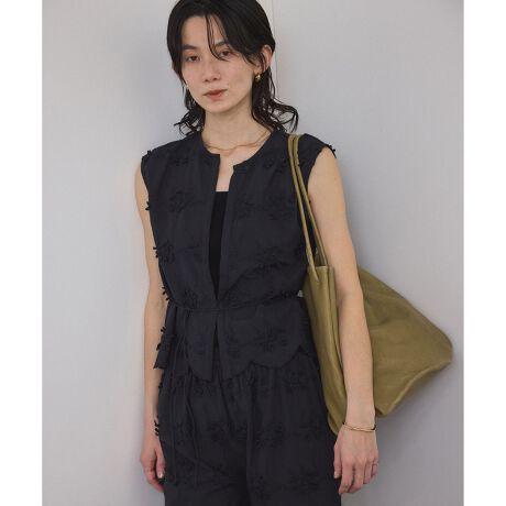 立体的な刺繍が印象的なレースのノースリーブブラウスです。フロントはホックで軽やかな仕様に。