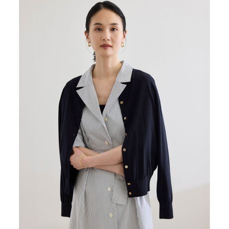 色々なシーンで活躍する、ワンランク上の大人ベーシックカーディガン。コンパクトながらも見頃や袖にややゆとりを持たせたつくりで、パンツにもスカートにも合わせやすい着丈となっています。ロゴを刻印したオリジナル金釦と見頃に施したアナグラム刺繍がアクセントになっています。