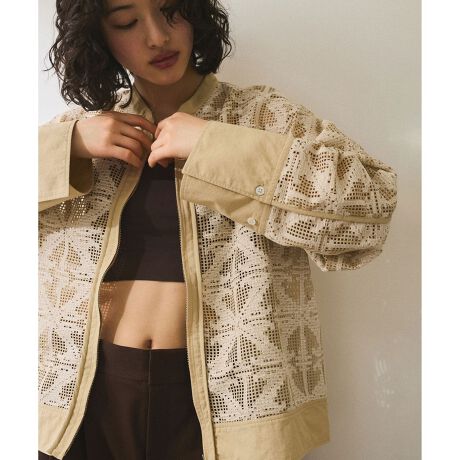 太めのメッシュ素材にオリジナルデザインの幾何柄の総柄刺繍を施した一着。