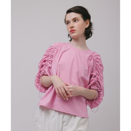 袖のたっぷりとしたギャザー分量と、後ろネックのVディティールがアクセントのブラウス。