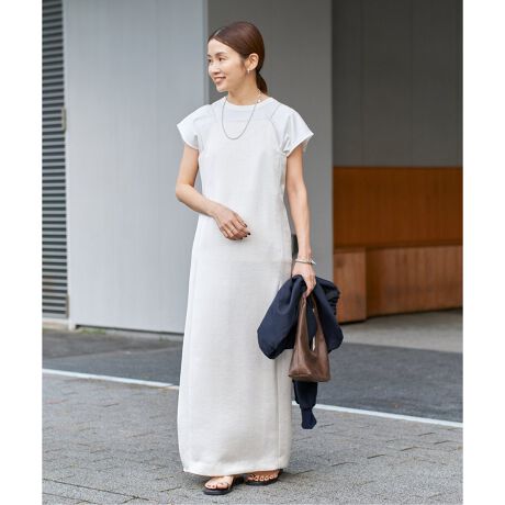 サテンならではの光沢が大人っぽく、Iラインシルエットを引き立てる一着。
