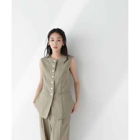 ボタンを全て留めてノースリーブトップスとしても着こなせるジレ。少し長めの着丈にし、ウエストに緩やかなシェイプを加えているのでスタイルアップして見えるシルエットです。中にトップスともレイヤードしやすいサイズ感で肌離れもよく、夏も涼しく着ていただけます。<素材>しっかり麻調な表面感でも滑らかで整った素地感でナチュラルなカラーもほっこりせずキレイめな印象。リサイクルポリエステル混素材を使用しています。<詳細>仕様・前ボタン裏地・なし透け感・なし / 光沢・なし / 伸縮性・ややあり 生地の厚さ・普通<シリーズ>パンツ[品番:0175130405]※モデルの着用画像の場合、光の当たり具合により、実際の色味と異なって見えることがございます。色味は、商品単体の画像をご参照ください。