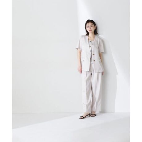微光沢のリネンライク素材を使用したストレートパンツ。2タックで腰まわりのラインをカバーしながらキレイに見せてくれます。センタープレスが入っているのできちんと見えし、カジュアルからキレイめオフィスシーンまで幅広いトップスとコーディネートしやすいデザイン。同素材のジャケットやベストと合わせて着用すると、よりこなれた印象のセットアップスタイルが叶います。<素材>ドライタッチのリネンライク素材を使用。さりげない微光沢感がこなれた印象を演出する素材です。<詳細>仕様・前ファスナー裏地・なし透け感・なし / 光沢・ややあり / 伸縮性・なし 生地の厚さ・普通<シリーズ>■半袖ジャケット[品番:0175155401] ■ベスト[品番:0175155402]