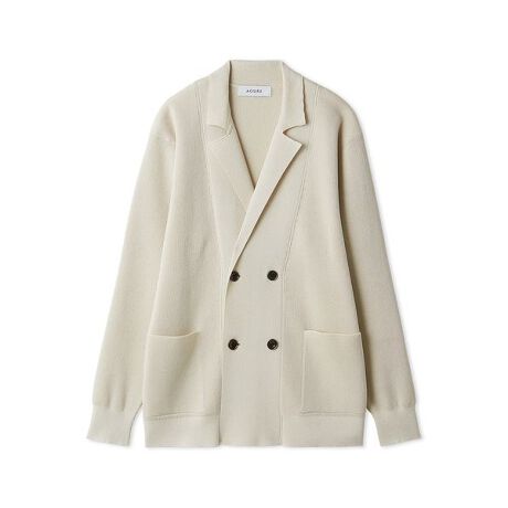 身頃の畝のある編み組織と前立の編地の切替が特徴的なダブルブレストのニットジャケットです。