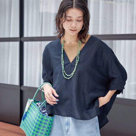 首回りがすっきりときれいに見え、アクセサリーも映える深Vネックのブラウス。