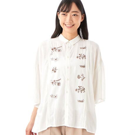 麻混シャンブレー単色アシンメトリー刺繍シャツブラウス