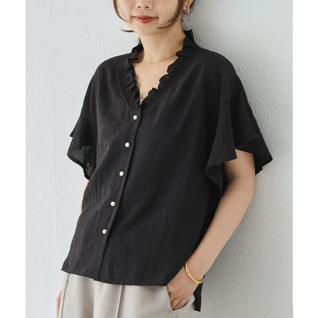 パールボタンをあしらった着映えする夏にぴったりのリネン混フリルブラウス。