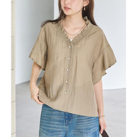 パールボタンをあしらった着映えする夏にぴったりのリネン混フリルブラウス。