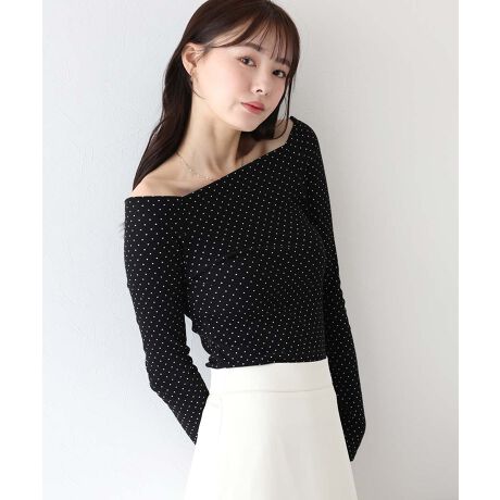 カジュアル過ぎずヘルシーなスタイリングが叶うドット柄オフショルダートップス。
