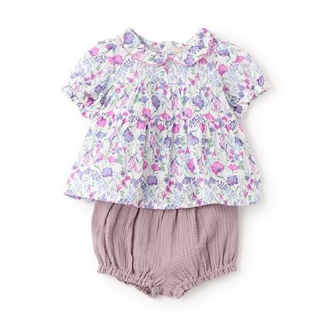 繊細なタッチで表現した花柄が華やかなチュニックとパンツのセットです。