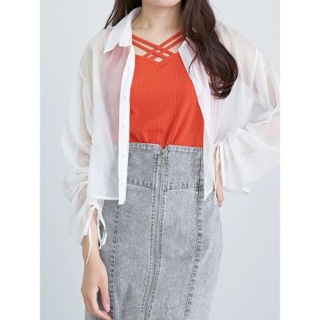 今旬のシアートップスとも合わせられ、胸元のクロスデザインで周りと差をつける大人の抜け感コーデを楽しめます。