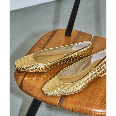 レザーをメッシュ状に編み込んだ立体感のあるアッパーが個性的なフラットシューズ。