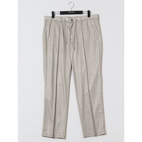 キチンと見えするルックスと楽ちんな穿き心地を兼ね備えた、ノータックのテーパードパンツです。ベルトループとドローコード付きの2WAY仕様、ウエストストレッチ、フロントファスナー、センタープリーツ加工、蜂のアイコン、前後ポケット付き。同素材のセットアップジャケットにスニーカーを合わせるとスポーティーな着こなしが完成します。プライベートからオフィスカジュアルまでオンオフ兼用で大活躍してくれます。