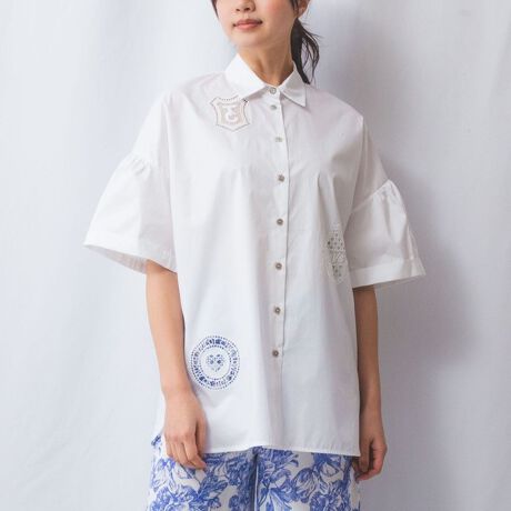 透かし模様のエンブレムがアクセントをプラスする半袖ブラウス。柔らかなふくらみのある半袖でフェミニンな女性らしい印象に。ドロップショルダーが華奢に見せてくれるのも嬉しいポイントです。丸みのある裾のフォルムもさりげないポイント。肌触りの良いコットン100%生地を使用しており着心地も快適です。散りばめられたモチーフレースの透け感で、レイヤードも楽しむことができるアイテムです。