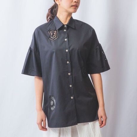 透かし模様のエンブレムがアクセントをプラスする半袖ブラウス。柔らかなふくらみのある半袖でフェミニンな女性らしい印象に。ドロップショルダーが華奢に見せてくれるのも嬉しいポイントです。丸みのある裾のフォルムもさりげないポイント。肌触りの良いコットン100%生地を使用しており着心地も快適です。散りばめられたモチーフレースの透け感で、レイヤードも楽しむことができるアイテムです。
