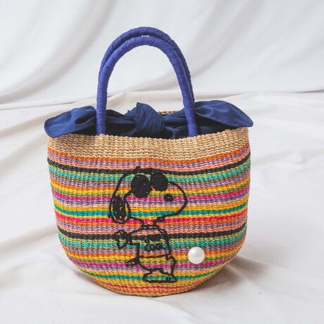 サングラスをかけたスヌーピーとマルチカラーボーダーが可愛いかごバッグ。カラフルなボーダーにチャーミングなスヌーピーとパールパーツが施された華やかさのあるデザインが魅力です。丸底のコロンとしたフォルムで見た目よりも沢山収納が可能。内側には便利なポケット付きです。間口はリボン結びすることができ、外から中身を見えにくくしてくれるのも嬉しい。コーディネートのポイントにもなる存在感のあるアイテムです。