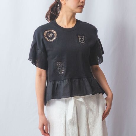 ふんわりとしたフリルがフェミニンさを漂わせる半袖カットソー。透かし模様のエンブレムがアクセントをプラス。清涼感のある生地を組み合わせることで、シーズンらしい軽やかなスタイリングを楽しむことができます。さらっと着られる着心地の良さも魅力。後ろ下がりの裾シルエットでスタイルアップ効果もあり、着こなしのこなれ感もさりげなく高めてくれるアイテムです。