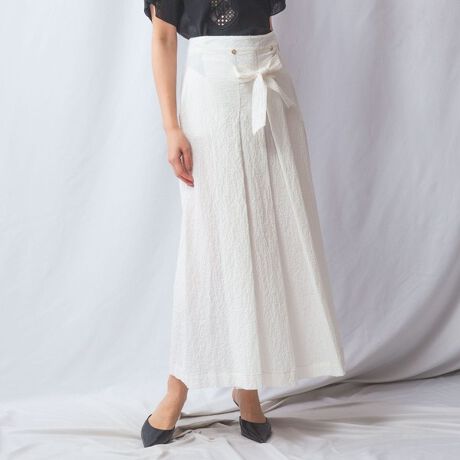 独特な表情のある生地使いが清涼感を漂わせるスカート。フロントにはボタンとリボンのアクセントをプラスし、タックインも映えるデザインに。タックプリーツの生み出す柔らかなフレア感と動きのあるシルエットで、上品な華やかさを演出してくれます。シーズンらしい軽やかなスタイリングを楽しむことができる爽やかなアイテムです。