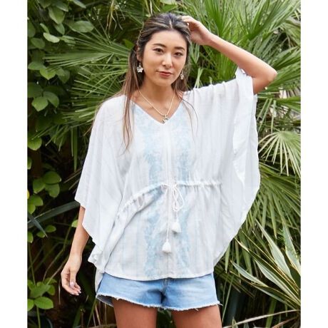 [型番:4IA-5111-2025]ハイビスカスなどのボタニカル柄の美しいデザインが特徴のポンチョトップス。やさしげなパステルカラーでどんなコーデにも合わせやすいです。ウエストのタッセル付きの紐でシルエットの変化を楽しめます。