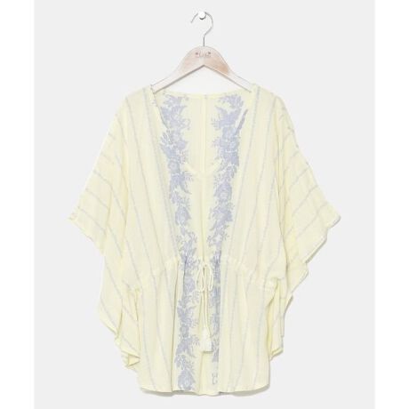 [型番:4IA-5111-2025]ハイビスカスなどのボタニカル柄の美しいデザインが特徴のポンチョトップス。やさしげなパステルカラーでどんなコーデにも合わせやすいです。ウエストのタッセル付きの紐でシルエットの変化を楽しめます。