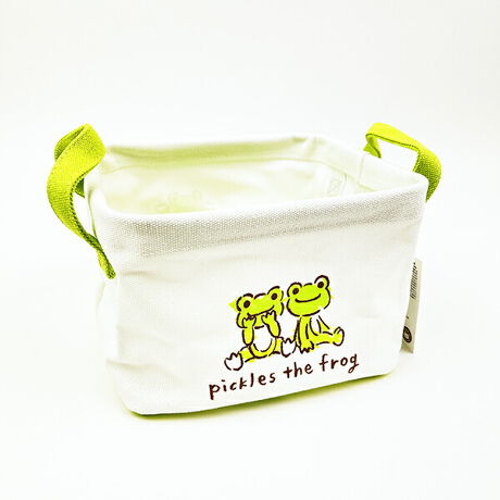 かえるのピクルスの小さめサイズで可愛らしいストレージボックスです。ワイヤー入りでしっかり自立し、使わないときはたたんでコンパクトにもなっちゃいます♪衣類やタオル、おもちゃの収納に活躍すること間違いなし!持ち手つきで、持ち運びにも便利な収納ボックスです☆