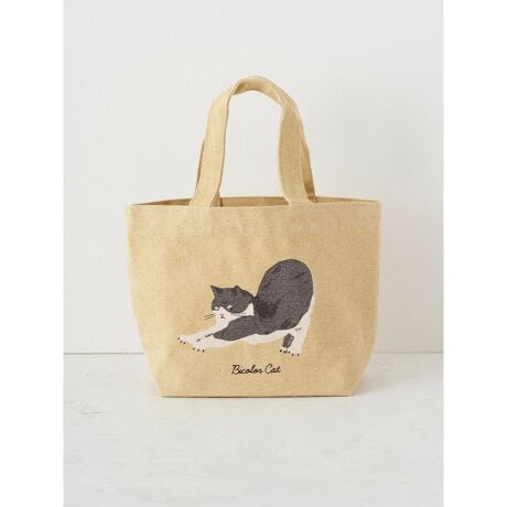 ぐーんと伸びをする猫のイラストに視線集中間違いナシ、なミニトート。小ぶりなサイジングながら底マチが幅広く、見た目以上の収納力を誇ります。ランチトートやお散歩バッグ、通勤・通学のサブバッグとしてもオススメ。使い込むほど風合いの出るキャンバス地を使用。