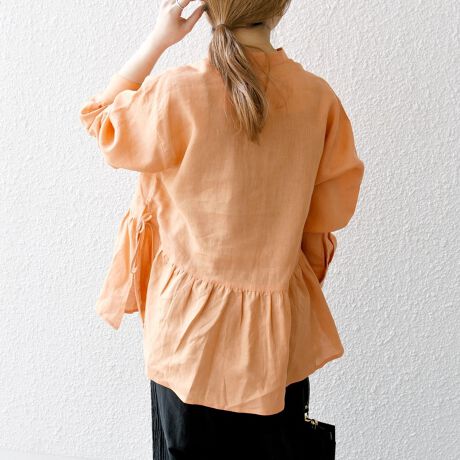 ウエストのペプラムギャザーが目を惹く、リネンシャツ。
