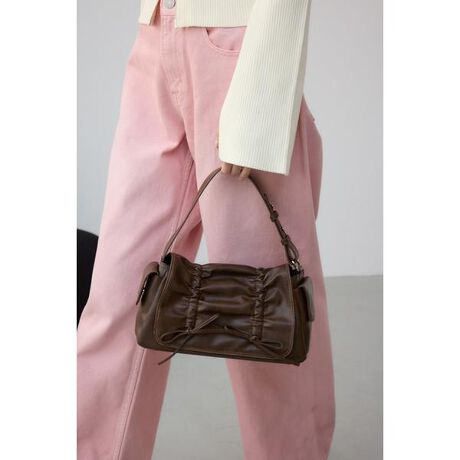 ■リボンデザインフラップバッグ ■ポイントフラップ部分にドロストリボンデザインが2本ついており、トレンド感満載のスタイリッシュなアイテムです。■ディティールフラップにはバフ加工が施され、シボ感やむら染め風の合成皮革が使用されており、ヴィンテージライクな見え方を実現。高級感とともに、落ち着いた雰囲気を持ち合わせたデザインです。両サイドにポケットがついていて、小物やさっと取り出したいアイテムを収納するのに便利。使い勝手の良さも抜群です。コンパクトな見た目ながら、500mlのペットボトルがすっぽり入る大容量で、日常使いにもぴったりなサイズ感です。ショルダー部分はギボシ金具で取り外し可能なので、ショルダーバッグとしても、ワンハンドルバッグとしても使える2WAY仕様が魅力。シーンに応じてアレンジできるので、コーディネートの幅が広がります。■スタイリングトレンドを抑えたデザインと実用性を兼ね備えたこのバッグは、デイリーユースからお出かけまで、幅広いシーンで活躍します。■素材カビが生えにくく手入れや保管が簡単なのが特徴です。濡れたままで長時間放置したり、他の素材と密着させないように保管してください。移染することがあります。表面を手作業で加工していますので、個々で風合いが異なりますが、デザインの特性ですのでご了承ください。[注意事項]※画像の商品はサンプルです。実際の商品と仕様、加工が若干異なる場合があります。※画像の商品は光の照射や角度、お使いのモニター環境により、実物と色味が異なる場合がございます。※着用、お取り扱いの際は、アテンションタグをご確認ください。