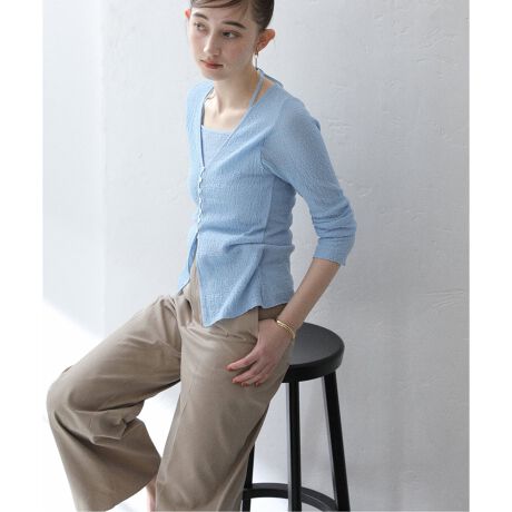 キャミとカーデをアンサンブルで着用した様なデザインは、テクニックいらずでお洒落な着こなしが完成します。