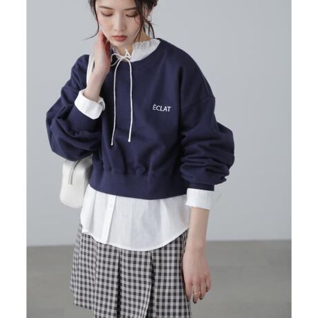肌触りが柔らかいコットン裏毛のショート丈スウェット。左胸にワンポイントでロゴ刺しゅうを入れたデザインは、着回しが効いて便利です。袖リブの上にはギャザーを入れてボリュームスリーブにし、丸いフォルムが出るようにしています。ツヤ感のあるサテンスカートやナイロンスカート合わせでフェミカジな着こなしがおすすめです。※ロゴの意味「ECLAT」輝き、閃光※モデルの着用画像の場合、光の当たり具合により、実際の色味と異なって見えることがございます。色味は、商品単体の画像をご参照ください。