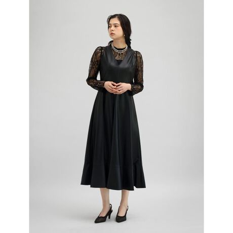シンプルでありながら洗練された印象を与える、Vネックデザインのフェイクレザードレス。