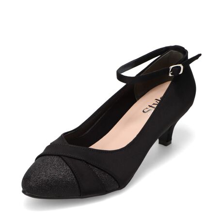 シンプルなデザインながらもアッパーのクロス部分ににキラキラのラメが目を惹くストラップパンプス。