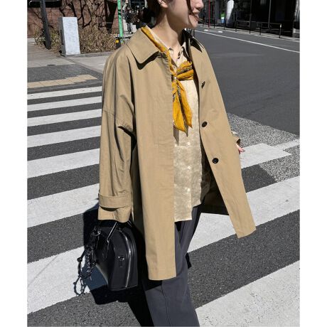上質な素材や女性らしいテントシルエットのアウトラインはそのままに、よりバランス良く着られるよう着丈を短くし、着方にバリエーションが出せるよう袖口の絞りを強くできるようにしています。一重で軽く薄いため、テントラインでも身体のラインをほどよくカバーしてくれる上、着用期間も長く着回せるライトアウターです。