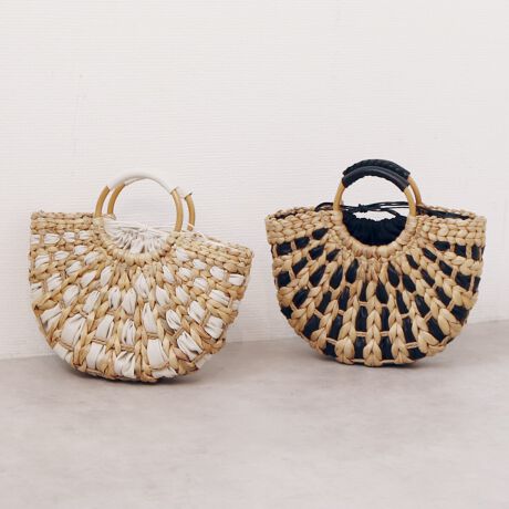 水草かごに合皮を編み込んだカゴバッグ。どんなコーディネートにも合わせやすいベーシックなかごバッグです。