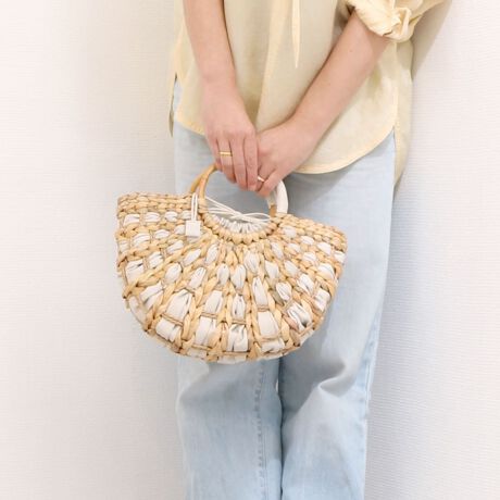 水草かごに合皮を編み込んだカゴバッグ。どんなコーディネートにも合わせやすいベーシックなかごバッグです。