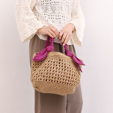 毎年ご好評をいただくクシュクシュハンドルと両側に下がったリボンがポイントのカゴバッグ。