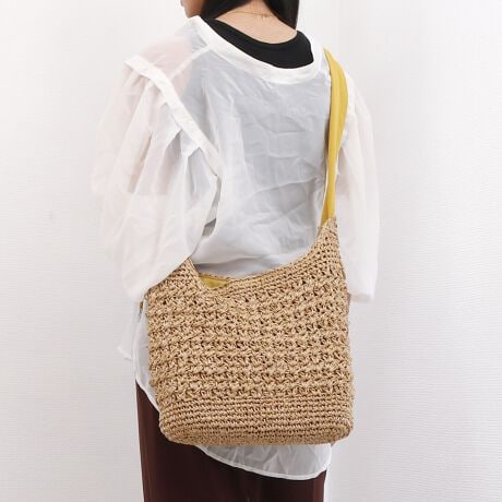 かごタイプのバッグは軽いのから重たいのまでありますが、これはとても軽かったです。写真で見るより実物の方が可愛らしかったです。肩に掛けたときに持ち手が幅広く、ずり落ちにくいと思います。大きさも丁度良かったです。中の物を出す時に素材が柔らかいため、くにゃっとして少し取り出しずらさはありますが、許容範囲かなと思いました。