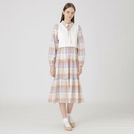 [型番:55J08520__]◆ニットドッキングドレス【Design】クレストブリッジチェックをメインにした華やかなニットドッキングドレスです。ニットの丈をショートにすることでスタイルアップが叶います。スカート部分は、ティアードデザインになっています。