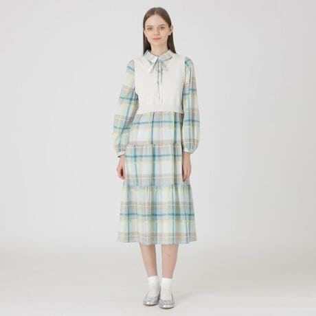 [型番:55J08520__]◆ニットドッキングドレス【Design】クレストブリッジチェックをメインにした華やかなニットドッキングドレスです。ニットの丈をショートにすることでスタイルアップが叶います。スカート部分は、ティアードデザインになっています。