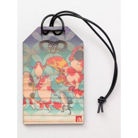 お守り袋の形の木製トラベルタグ。大きく成長し寿命が長い事から、縁起物として伝えられていた杉の木を使用。和の伝統柄、民芸、浮世絵のデザインが目を引く、旅のお守りにぴったりなアイテム。