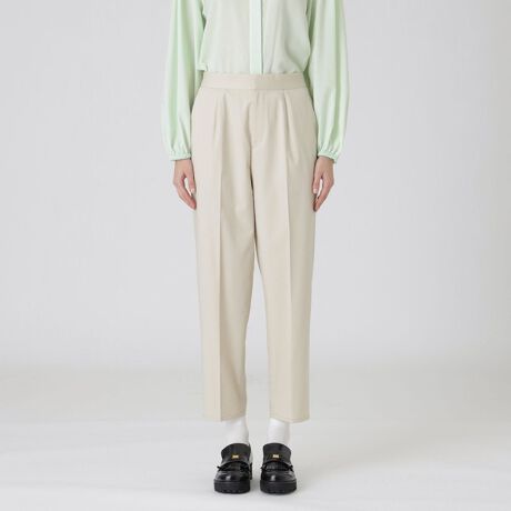 [型番:55R03526__]◆テーパードシルエットのスリムパンツ【Design】シンプルなスリムパンツです。裾に向けてテーパードしたシルエットです。フロントのクリーズラインがきれいめな印象をもたらします。後ろウエストはゴム仕様のため締め付け感なく着用いただけます。