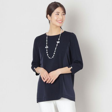 前身頃をニット、後身頃に布帛を使ったドッキングチュニックです。ヨーク部分と裾部分にピンタックデザインを施し、フリルデザインをバックスタイルにアクセントをつけたデザインチュニックです。袖にはパールビジューをあしらったエレガンスなデザインのチュニックです。