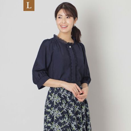 襟、前立てにかけてアイレットレースを挟み込んだインナーにも合わせやすいデザインブラウスです。