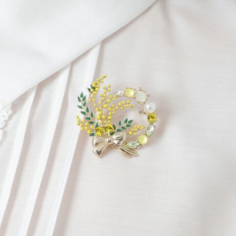 [型番:W5V34522__]フラワーブーケブローチサイドから中心にかけてミモザに模したフラワーブーケを配置して、リボンやビジューで華やかに彩ったブローチ。身に付けるだけでコーディネートを華やかにしてくれます。※この商品はサンプルでの撮影を行っています。実際の商品とイメージ、仕様が異なる場合がございます。