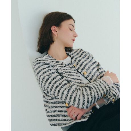 ツイード調のマリンボーダー柄がコーディネートにアクセントを添える、ノーカラージャケット。