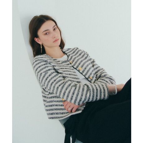 ツイード調のマリンボーダー柄がコーディネートにアクセントを添える、ノーカラージャケット。