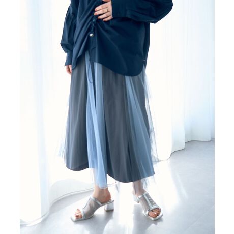 配色デザインが目を惹くチュールスカートと、マットな同色フレアスカートの2点セット。
