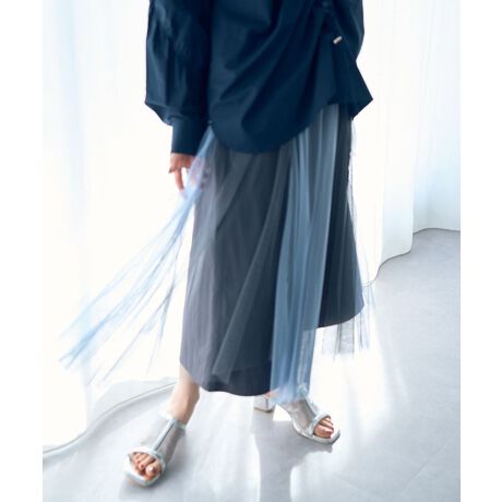 配色デザインが目を惹くチュールスカートと、マットな同色フレアスカートの2点セット。